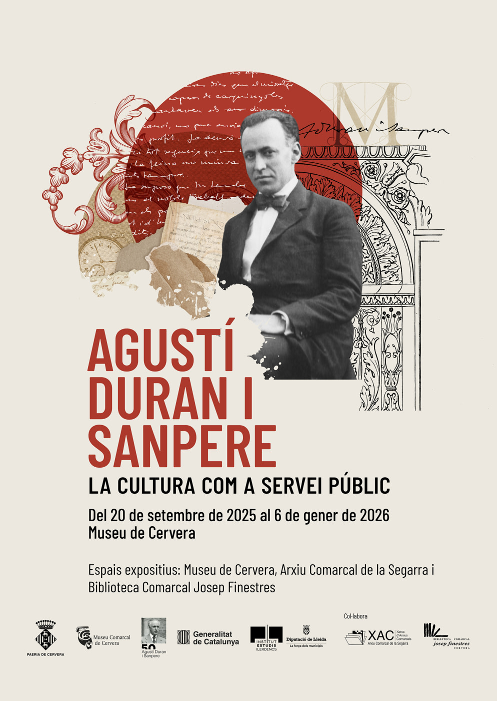 La ciutat de Cervera esdevindrà punt de partida de la commemoració nacional del cinquantè aniversari de la mort d’Agustí Duran i Sanpere (1887-1975), un dels grans historiadors i gestors culturals de Catalunya, amb la inauguració de l’exposició Agustí Duran i Sanpere. La cultura com a servei públic. La mostra, produïda pel Museu Comarcal de Cervera, s’obrirà el 20 de setembre en el marc de la Festa Duran i Sanpere i es podrà visitar fins al 6 de gener de 2026. Posteriorment, iniciarà un recorregut itinerant per diversos punts del país.